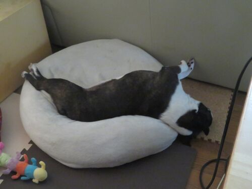 きのうのわんこ・・・ 飼い主、少し元気になってきたので、小粒と遊びました。 小粒も楽しそうに、何度もイモムシくんを取ってきては置いて 「投げて~」を繰り返していました。 ひとしきり遊んだあとは、 イモムシくんをペロペロしお昼寝していました。 小…